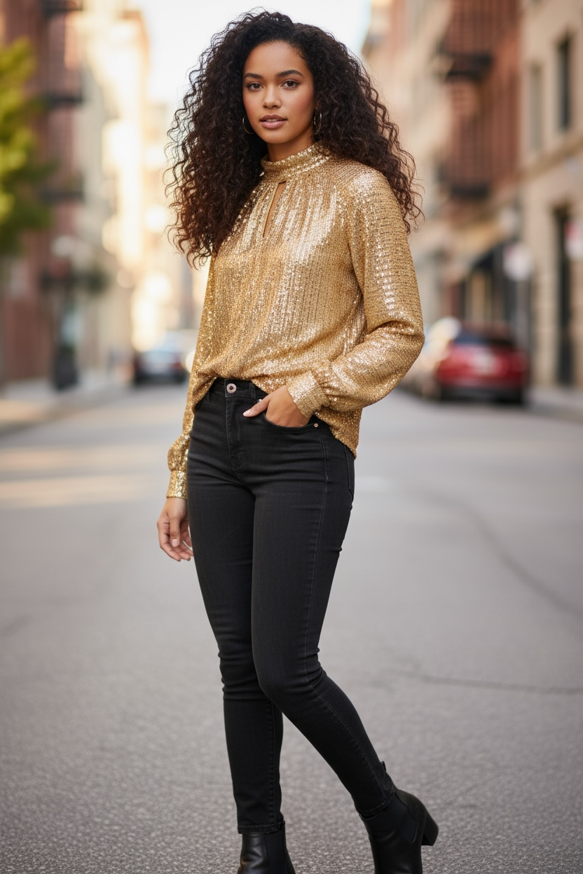 Solid Metallic Sequin Balloon Sleeve Blouse