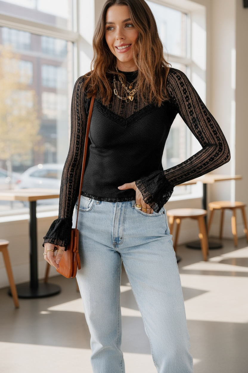 Elevate your wardrobe with this top. The delicate patchwork adds a sophisticated, romantic touch, while the sleeves offer graceful movement and a flattering feminine silhouette. Designed with a slim fit that contours your curves, this...